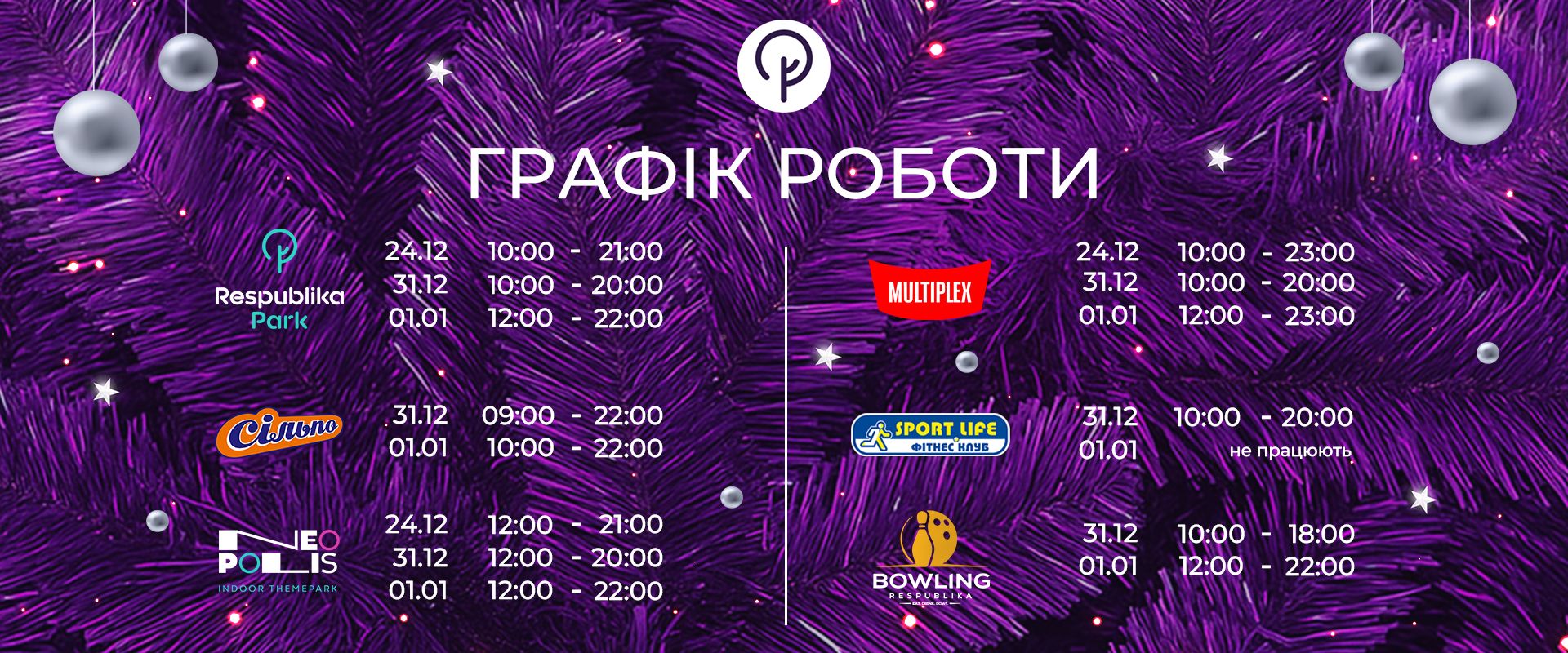 ТРЦ Respublika Park 24 грудня працюватиме з 10:00 до 21:00, 31 грудня з 10:00 до 20:00, 1 січня — з 12:00 до 22:00